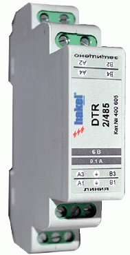 Пример: DTR 2/485-L -УЗИП производства ЗАО "Хакель Рос" для защиты оборудования слаботочных цепей, размещено в корпусе для крепления на DIN-рейку 35 мм, количество пар защищаемых проводников -2,номинальное рабочее напряжение UN= 6 В DC, номинальный ток IN=100 мА, скорость передачи данных 10 Мбит/с, первая ступень защиты выполнена на газонаполненных разрядниках с Imax(8/20)=20 кА, вторая ступень защиты выполнена на TVS-диодах с Рppm=1500 Вт. Применяются для защиты оборудования от заноса высокого потенциала со стороны линий RS-485.